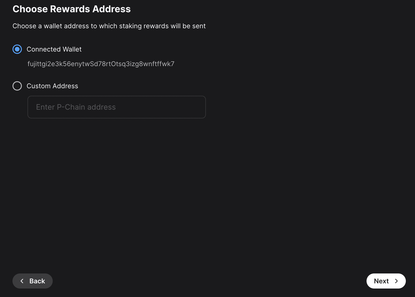 Choose the address that the network will send rewards to. Make sure it's the correct address because once the transaction is submitted this cannot be changed later or undone. You can choose the wallet's P-Chain address, or a custom P-Chain address. After entering the address, click Next.