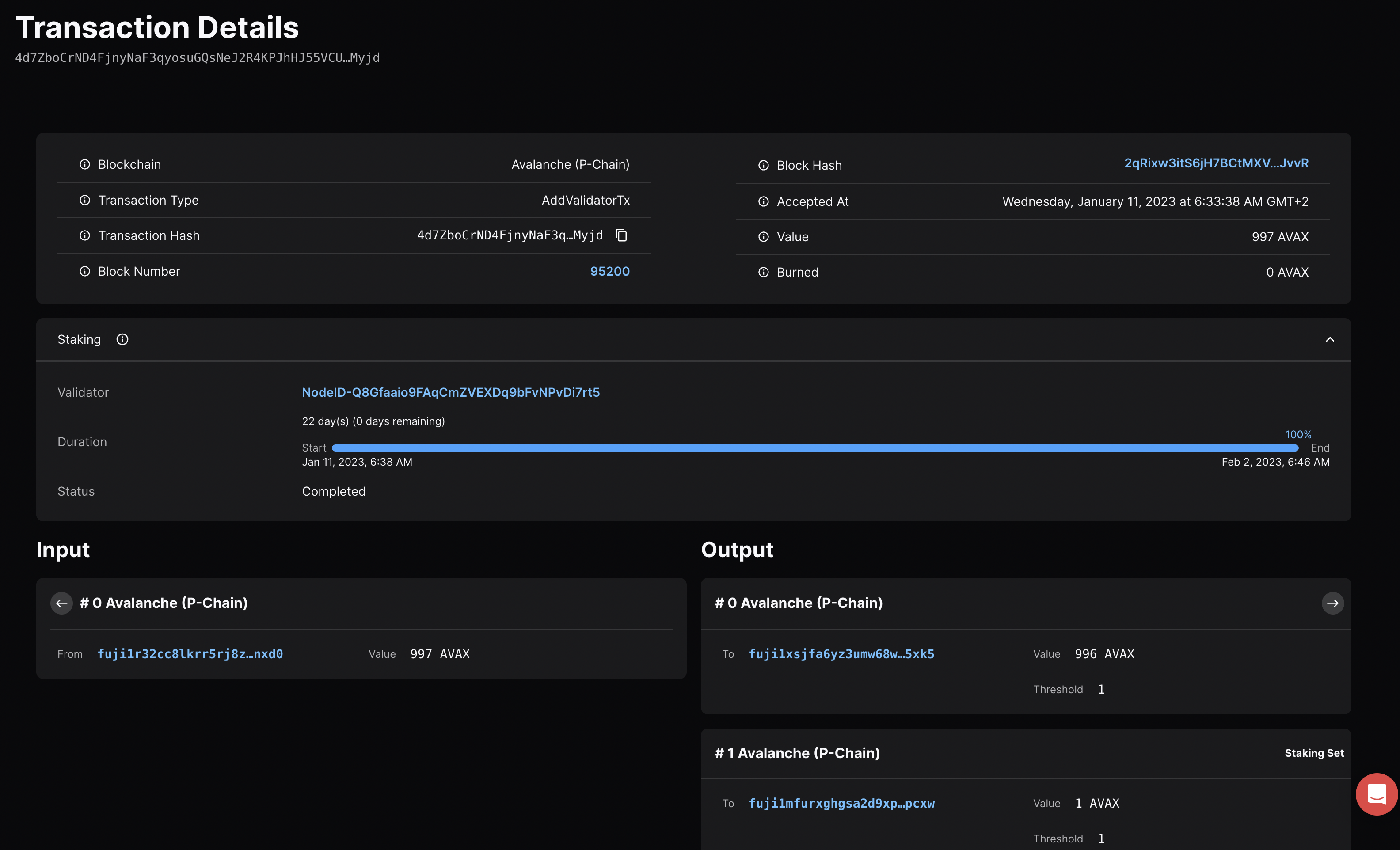 If you click on View on explorer, a new browser tab will open with the details of the AddValidatorTx. It will show details such as the total value of AVAX transferred, any AVAX which were burned, the blockchainID, the blockID, the NodeID of the validator, and the total time which has elapsed from the entire Validation period.