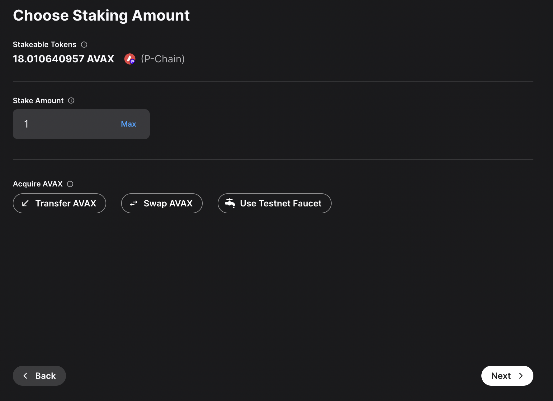 • Stake Amount: The amount of AVAX to lock for staking. On Mainnet, the minimum required amount is 2,000 AVAX. On Testnet the minimum required amount is 1 AVAAX.